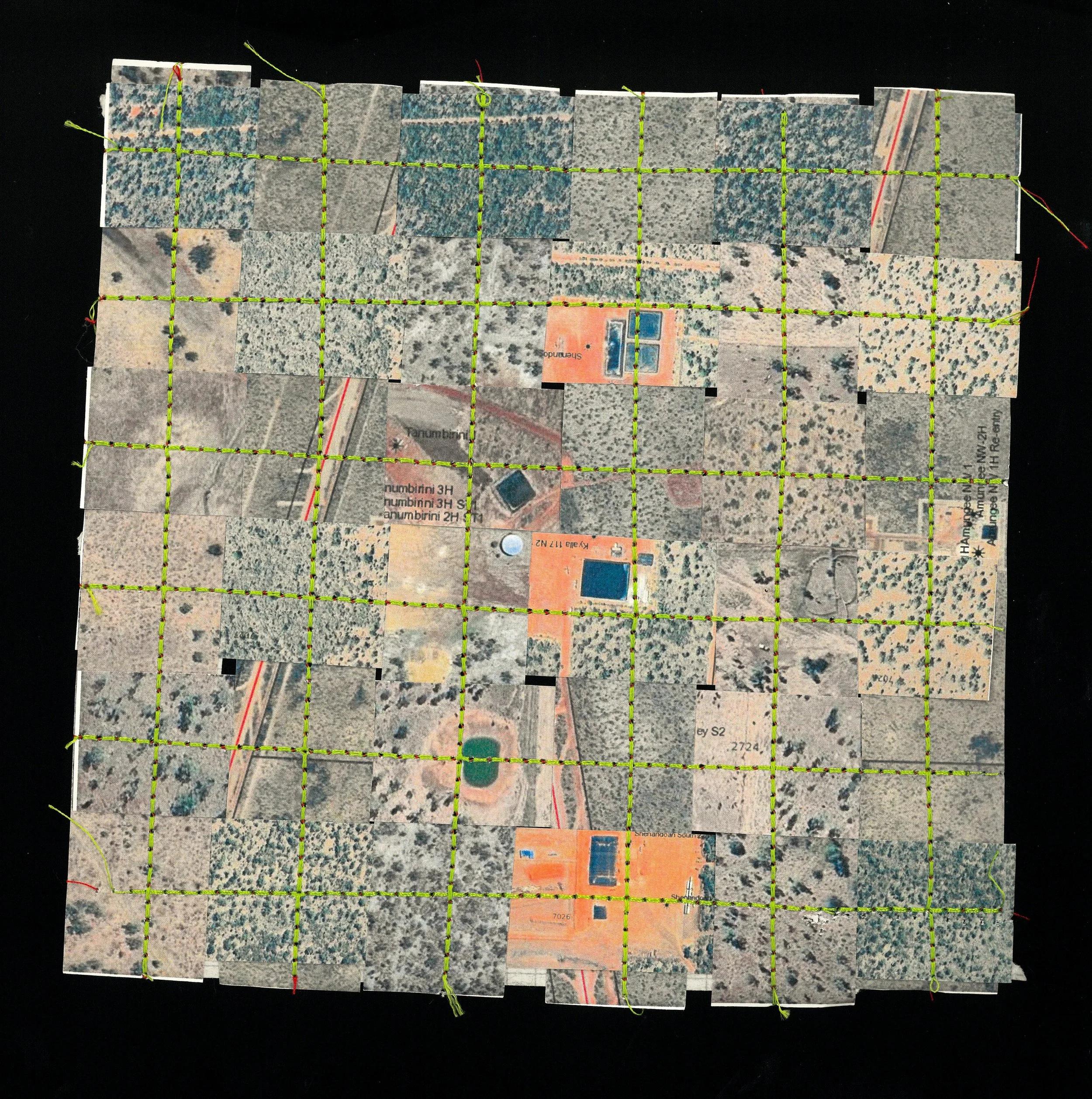 This work is composed of satellite images of fracking wells across the Beetaloo Basin in the Northern Territory, which I have printed, cut, woven, and stitched together into a patchwork. The images represent a rewriting of the landscape, a point where relations are interrupted, yet the stitched seams gesture toward repair, care, and reconnection.
